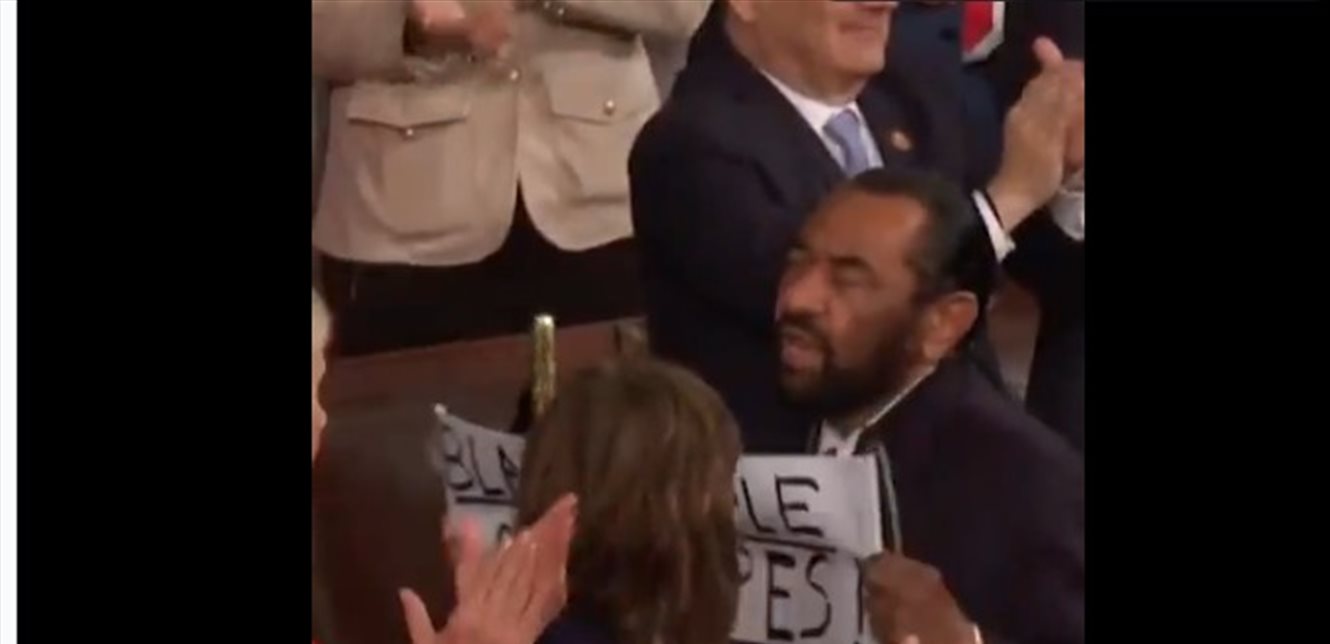 خلال إلقاء الرئيس الأميركي دونالد ترامب خطاب حالة الاتحاد أمام الكونغرس، رفع نائب ديمقراطي من أصل إفريقي لافتة كتب عليها “السود ليسوا قرودا” قبل أن يتم اقتياده خارج القاعة.